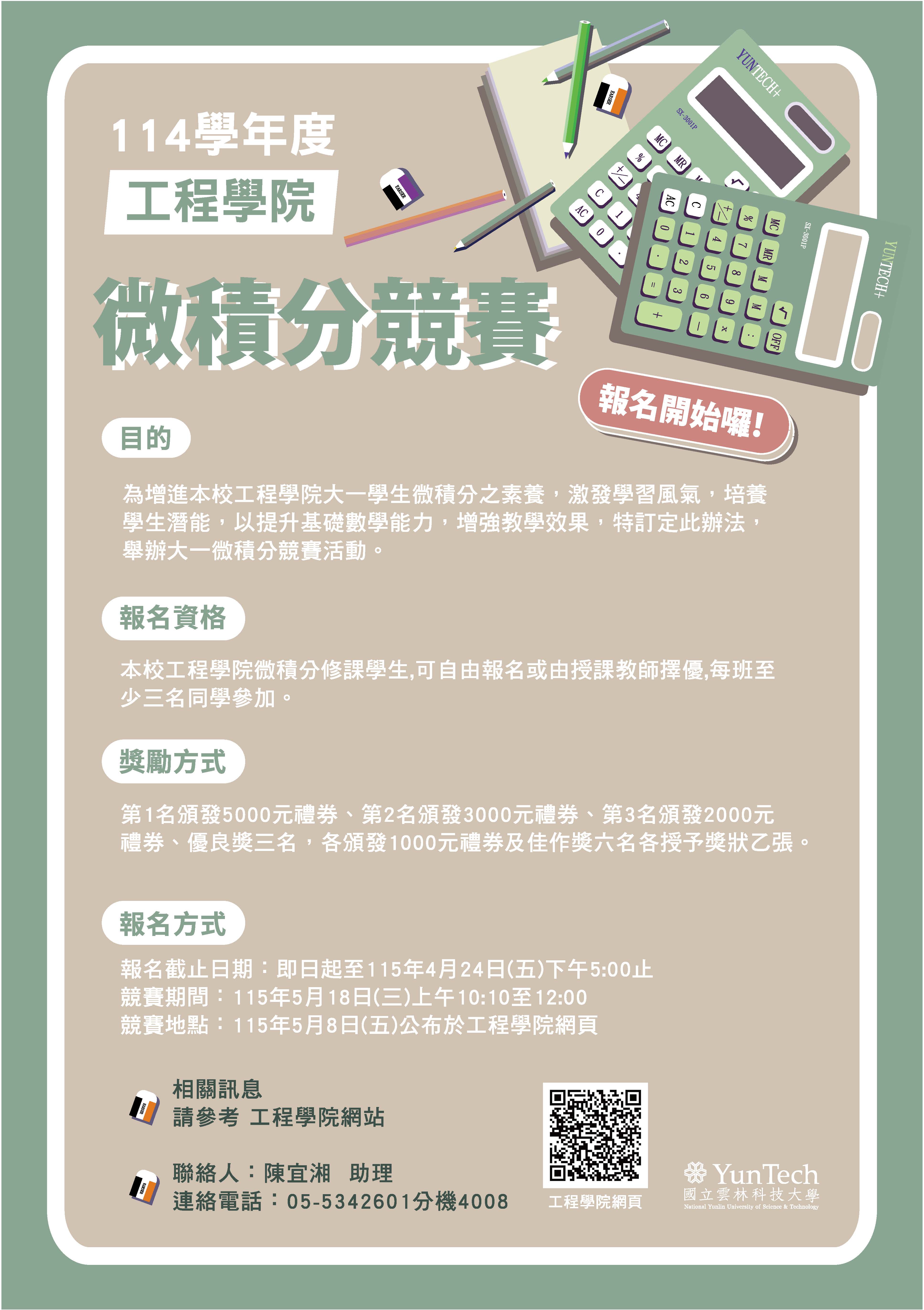 為增進本校工程學院大一學生微積分之素養,激發學習風氣,培養學生潛能,以提升基礎數學能力,增強學習效果。特訂此辦法,舉辦大一微積分競賽活動。只要是本院修習微積分之學生,可自由報名或由授課教師擇優,每班至少推派三名同學參賽。