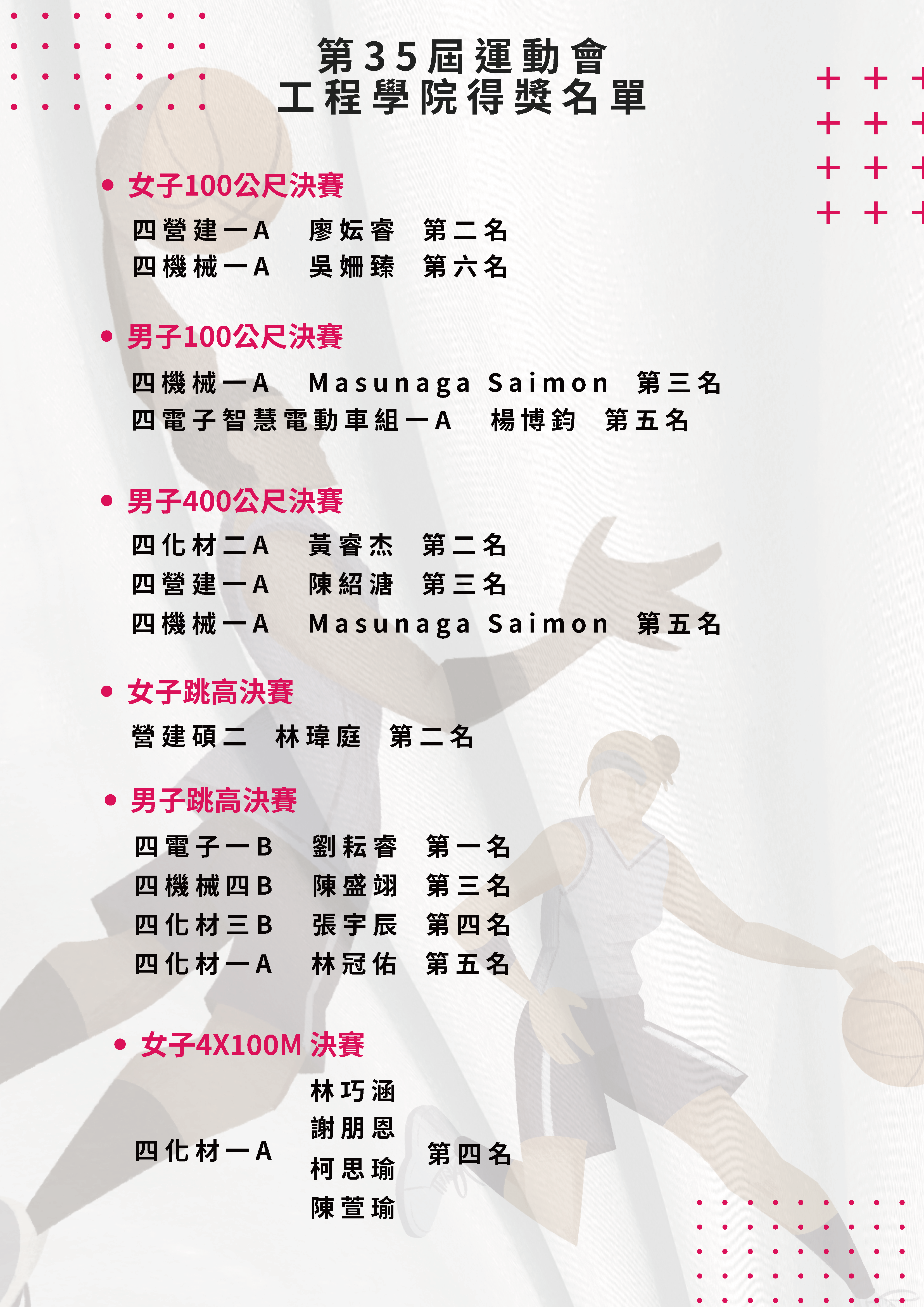 【恭賀】第 35 屆運動會工程學院得獎名單