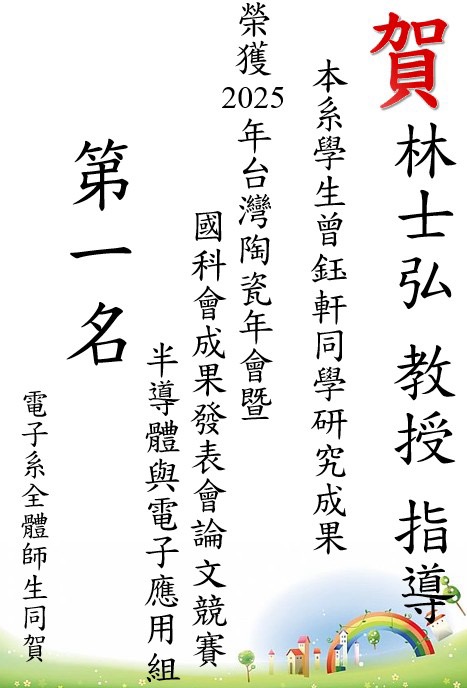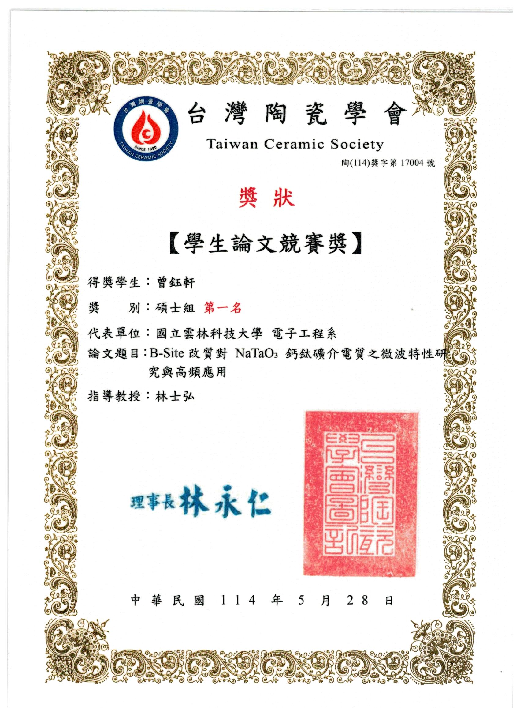 在本校電子工程系林士弘老師指導下,電子工程系碩士生曾鈺軒以論文題目「B-Site 改質對 NaTaO₃ 鈣鈦礦介電質之微波特性研究與高頻應用」參與2025年台灣陶瓷學會年會暨國科會成果發表會之學生論文競賽,憑傑出研究成果榮獲碩士組第一名,展現雲科大的研發能量與創新實力。 工程學院與電子工程系同賀林士弘老師與曾鈺軒同學獲此佳績,感謝師生團隊的投入與努力,為校爭光! (頒獎日期:民國114年5月28日)
