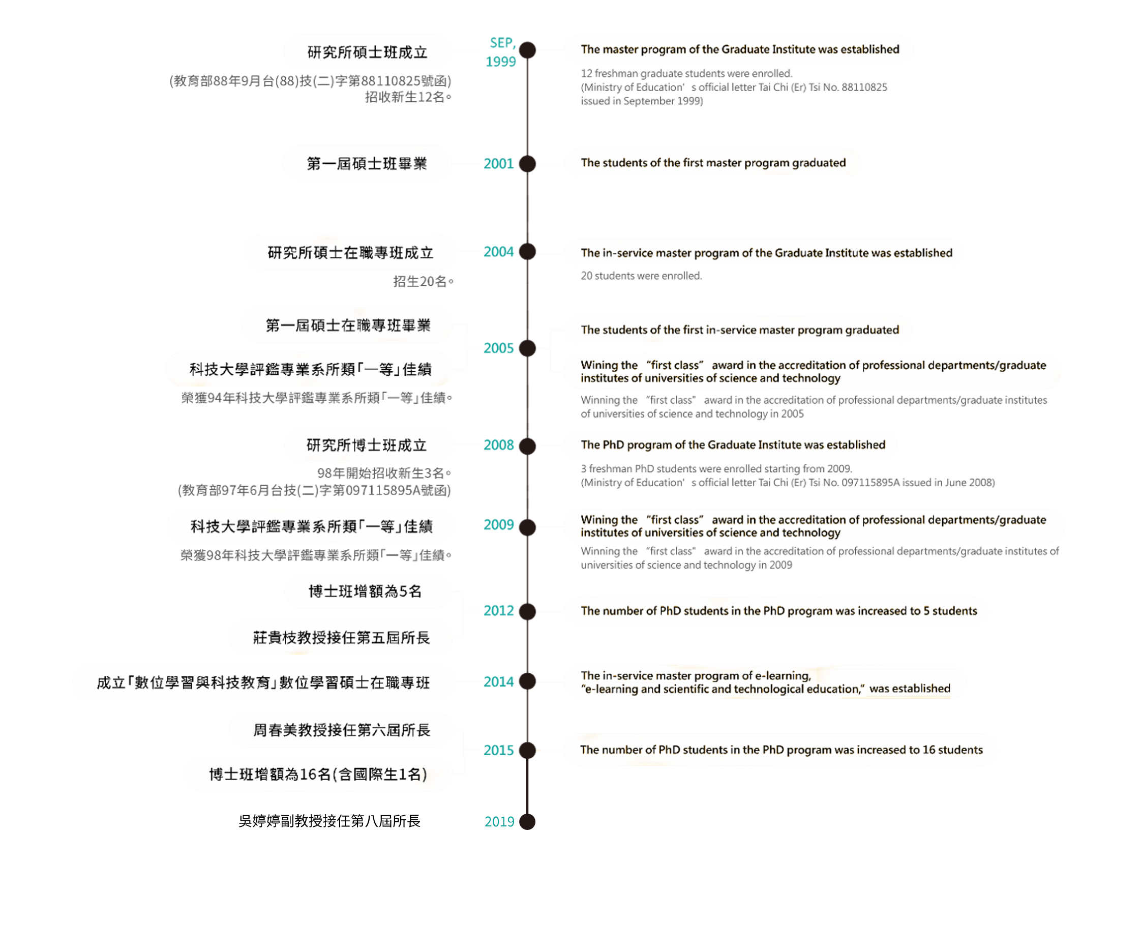 This Graduate Institute was formally established according to the Ministry of Education’s official letter Tai Chi (Er) Tsi No. 88110825, as issued in September 1999.