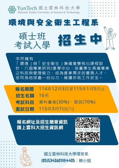 歡迎各位新生就讀本系 提醒各位新生相關事情 一、新生開展營活動:9月2日至9月4日。 二、務必於9月2日攜帶相關證件到校:畢業證書正本及影本、身分證正反面影本。 三、本系新生手冊請參閱附件。 最後歡迎加入本系大家庭 期望未來的四年能有所收穫